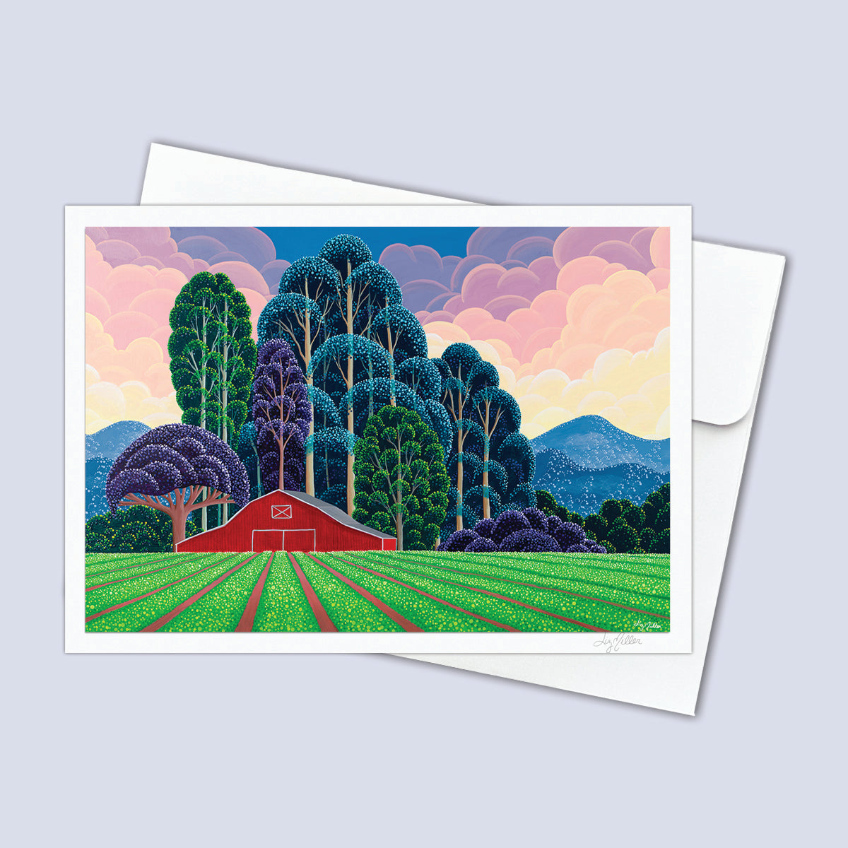 This glorious sunset sky is highlighted by green fields in the foreground and a bright red barn in the background.