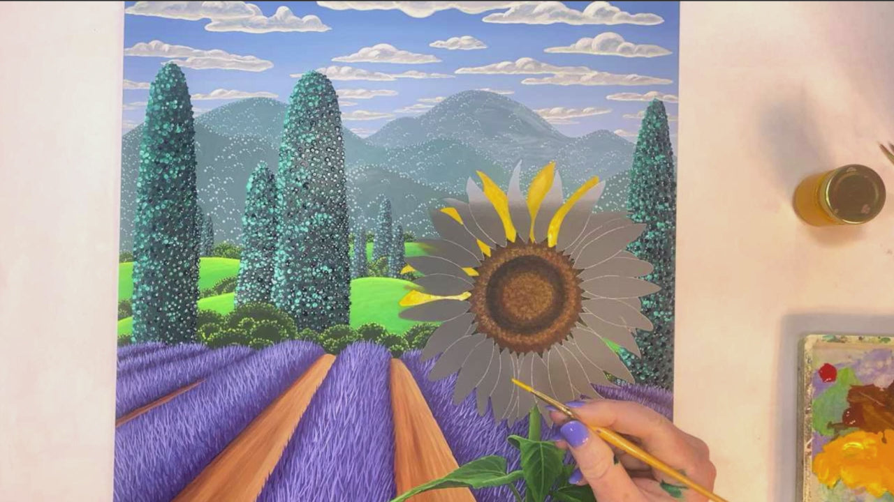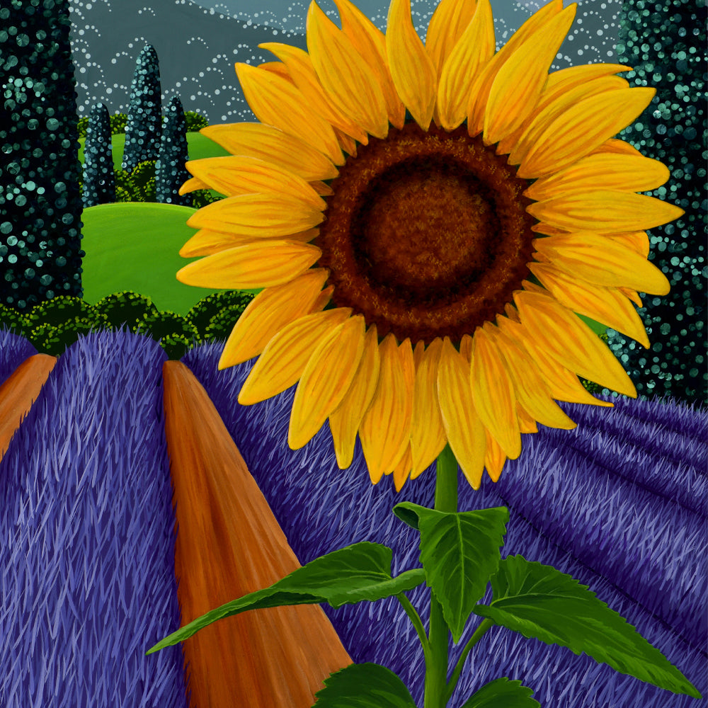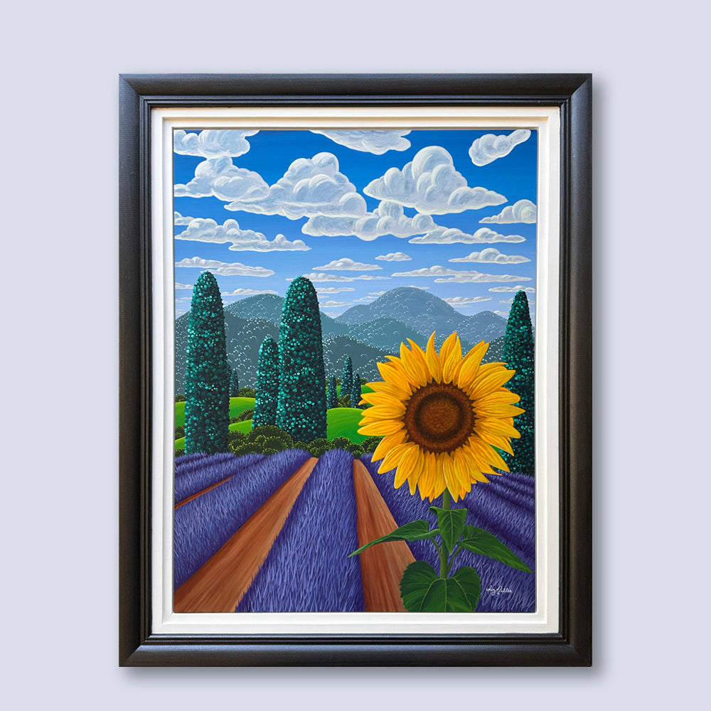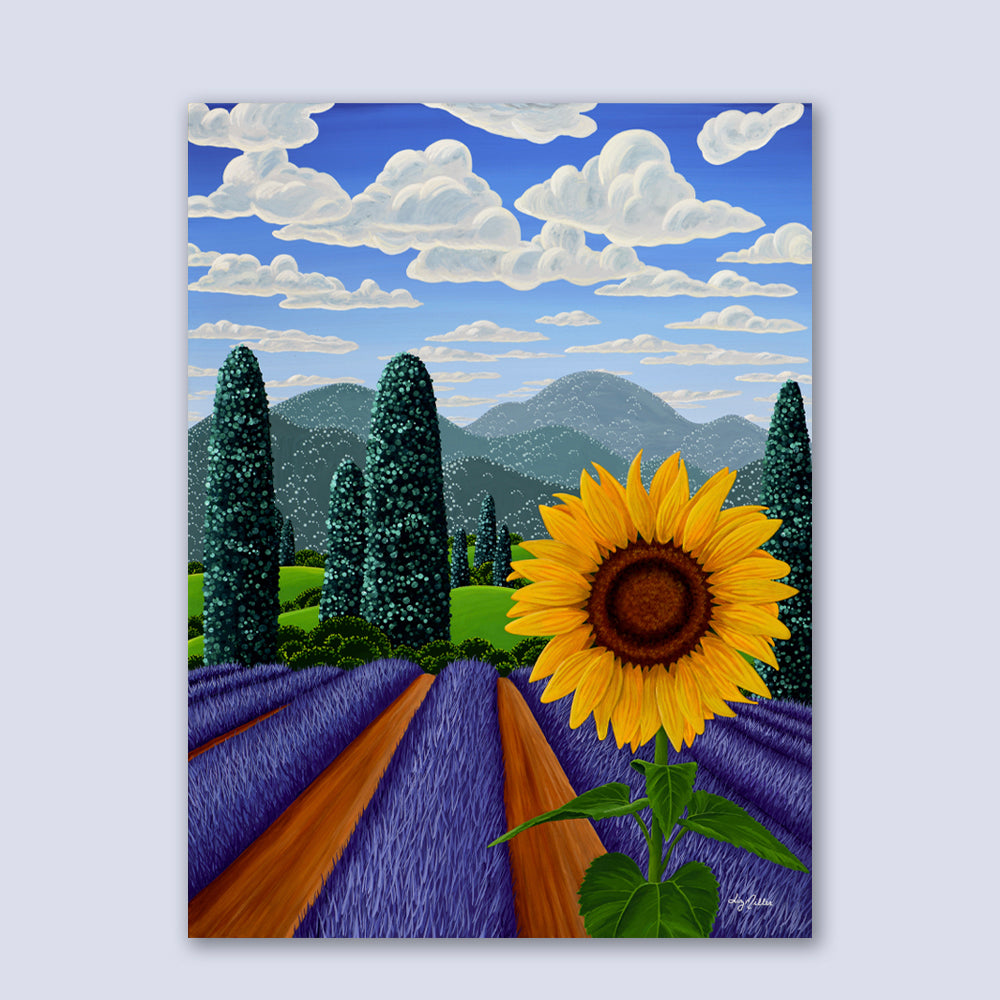 A large brilliant sunflower towers over a field of lavender in this peaceful landscape painting.