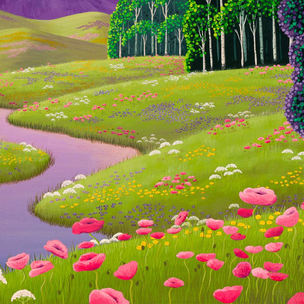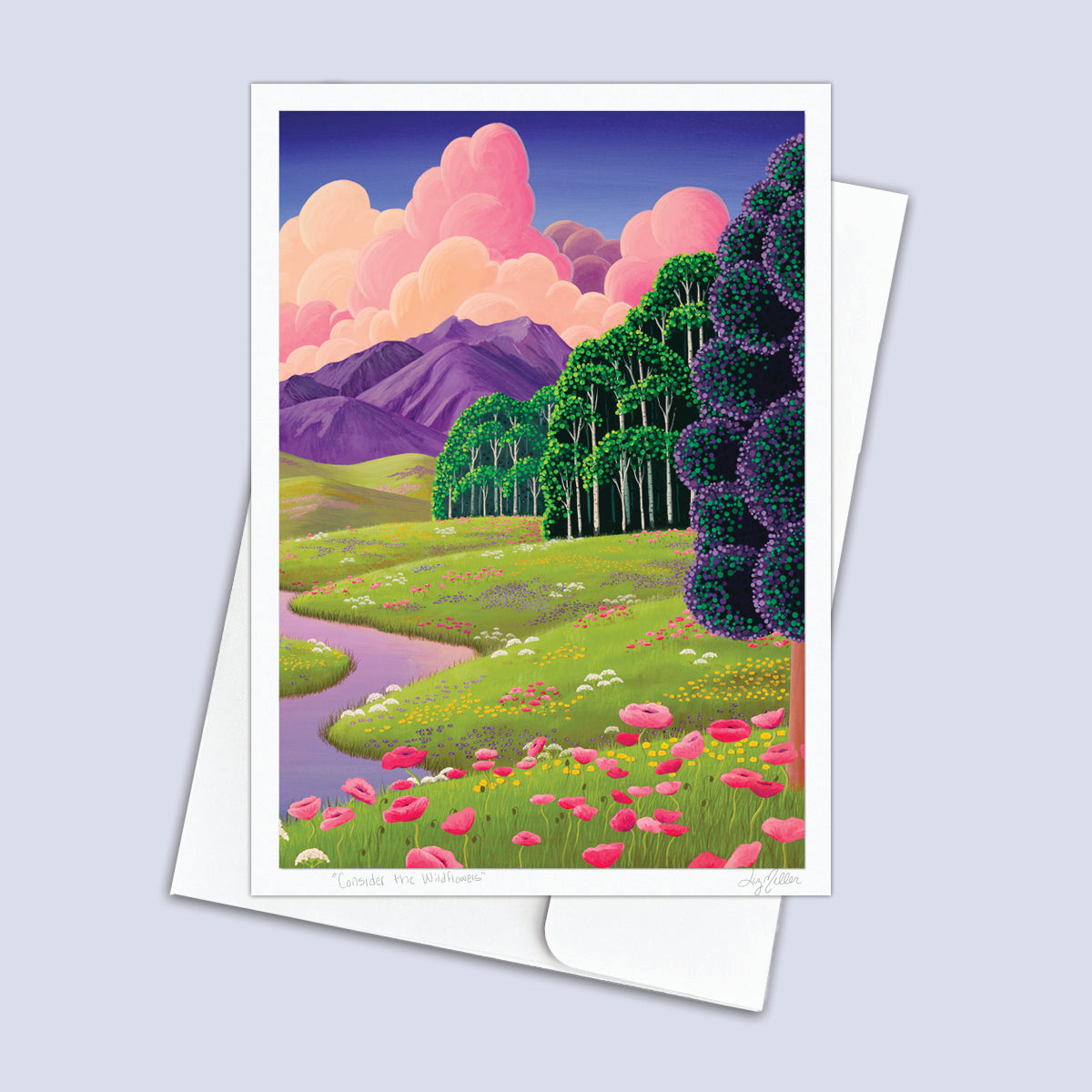 Colorado front range painting with bright, colorful wildflowers blooming along a meandering stream. This painting is based on Luke 12:27-28