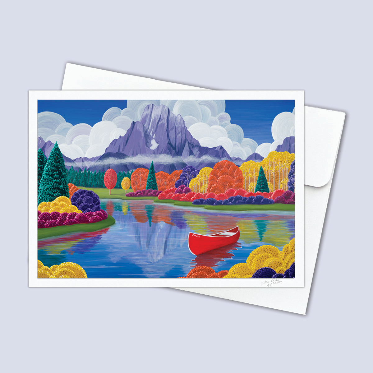 A spectacular fall setting in Tetons National Park. Mount Moran is seen towering in the background with a welcoming red canoe in the foreground. This piece is based on John 3:16