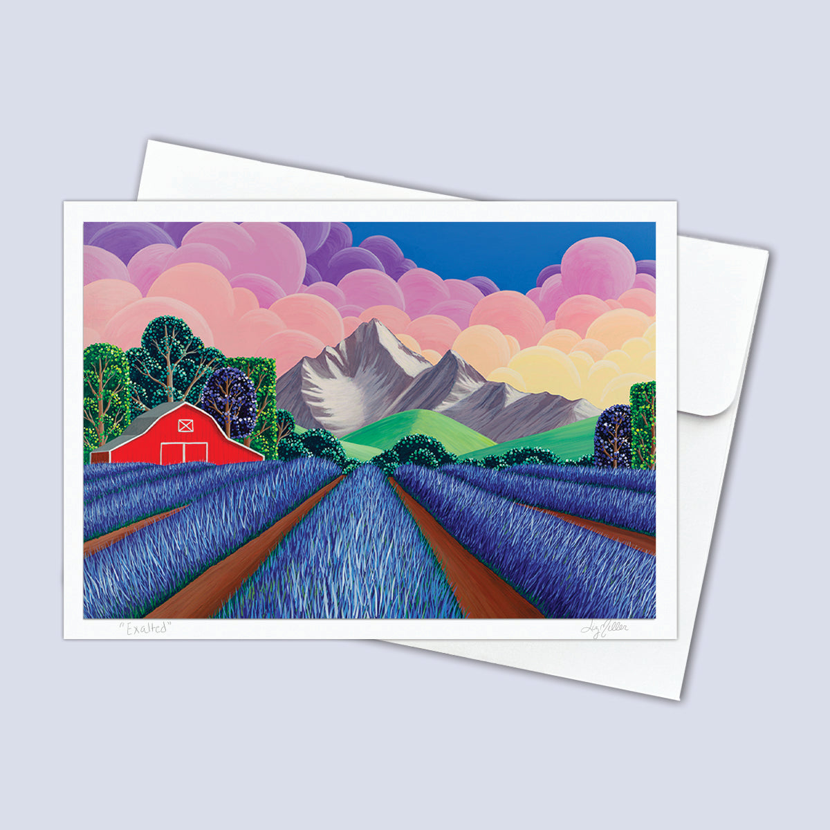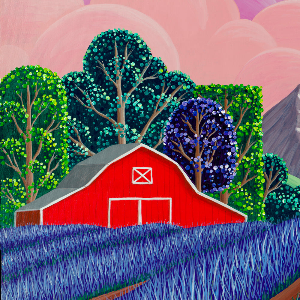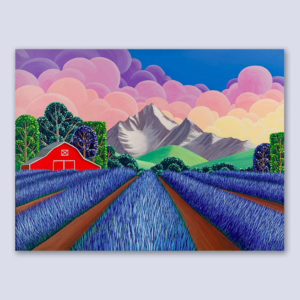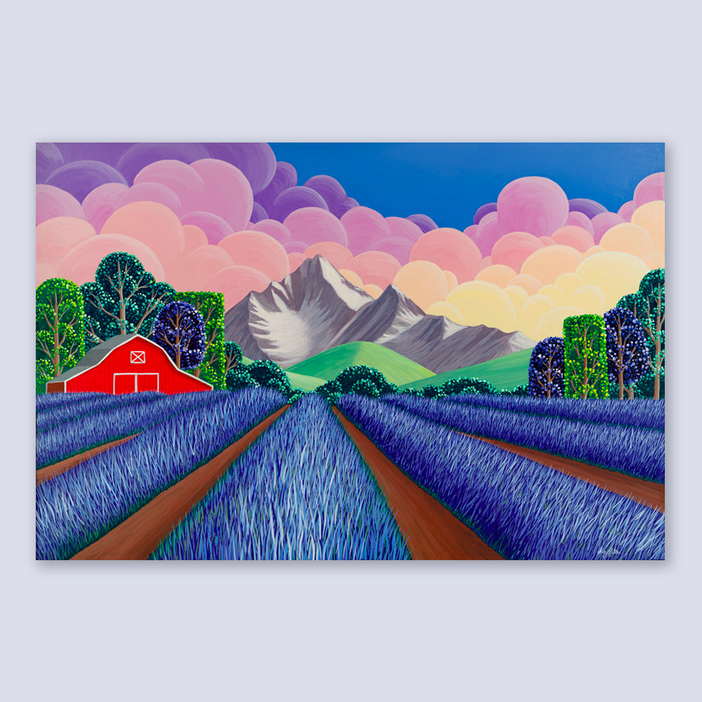 This glorious sunset sky is highlighted by purple fields of lavender, a bright red barn, and towering mountains in the background.