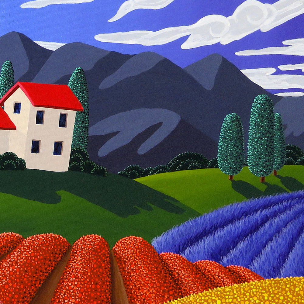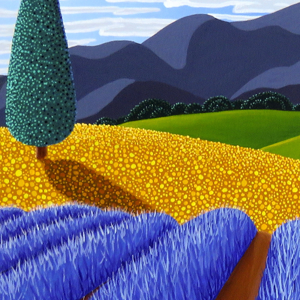 A Mediterranean landscape with fields of vibrant purple, yellow, orange, and green. Hundreds of individual dots of paint go into creating these colorful fields of flowers and trees.