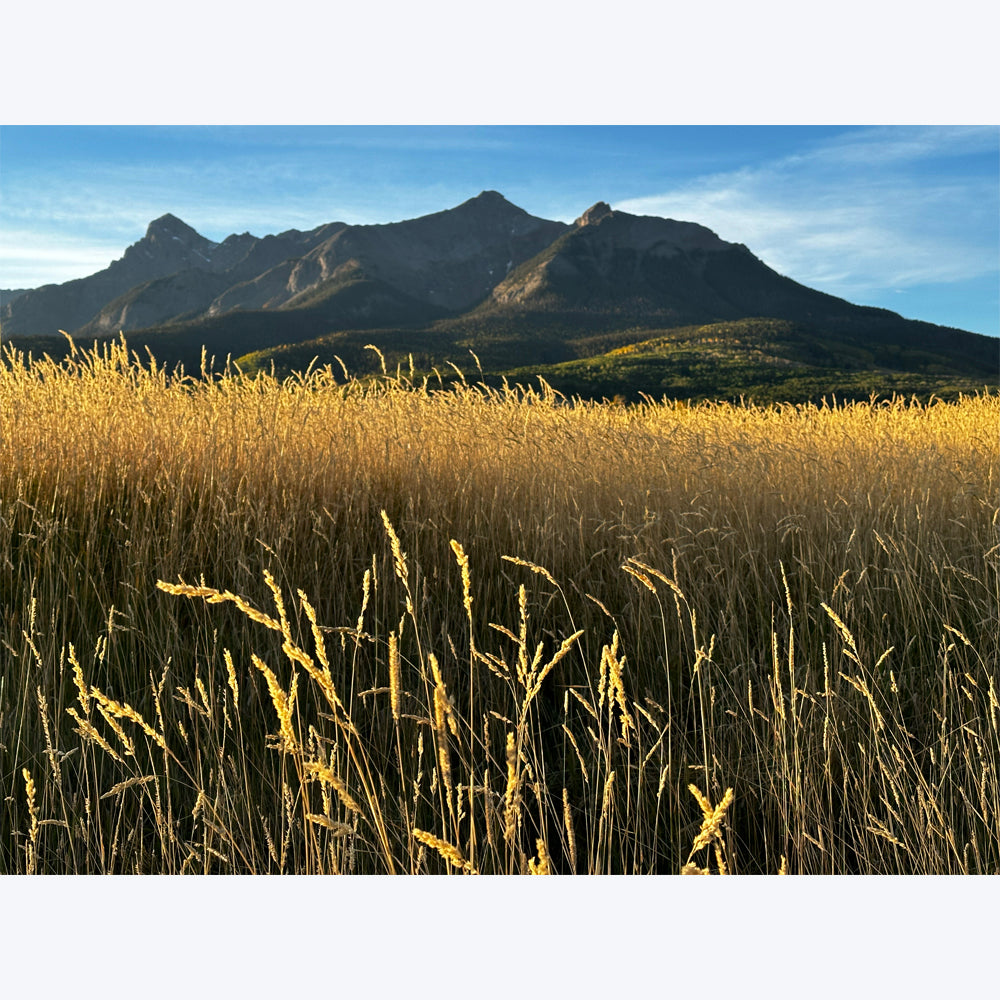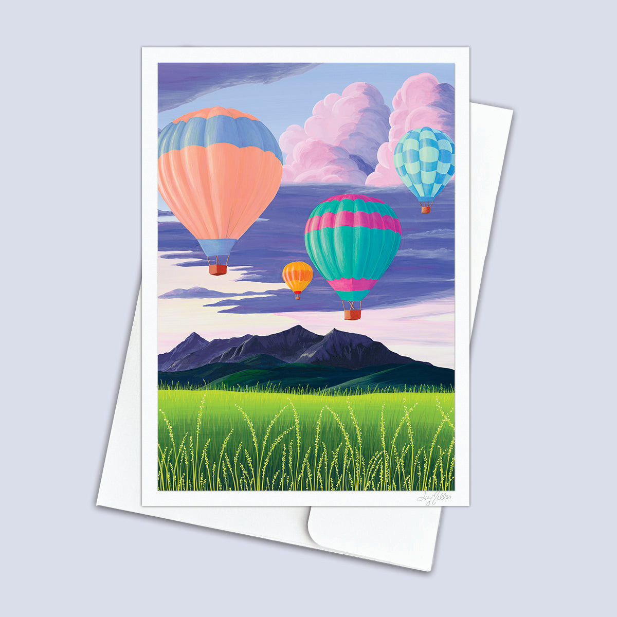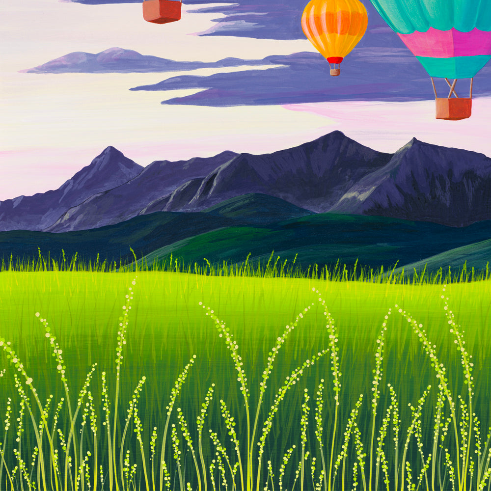 Bright and colorful hot air balloons float above green fields of grass. The San Juan mountains near Telluride, Colorado are seen in the background. I have included a reference photo I took in the Fall of 2023.