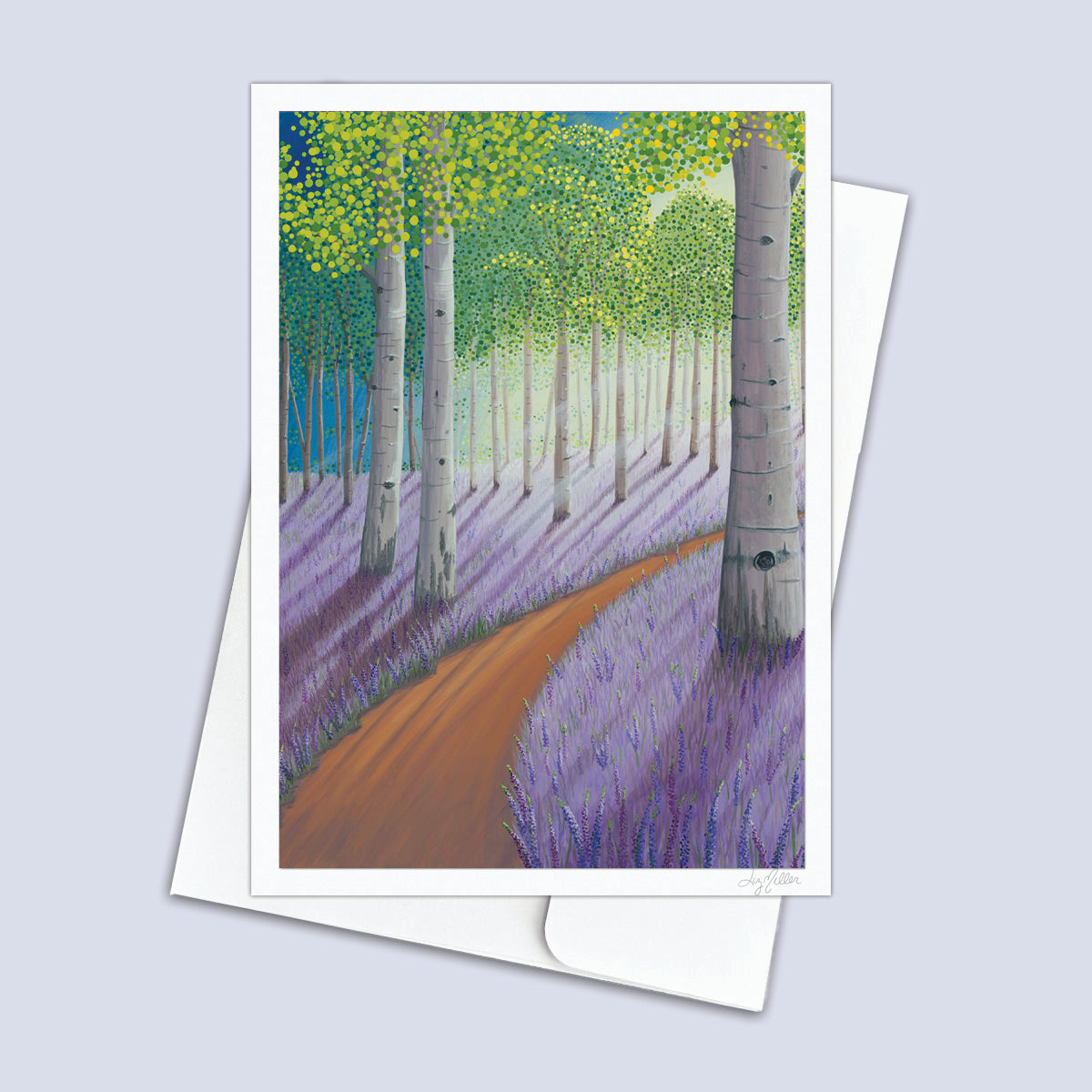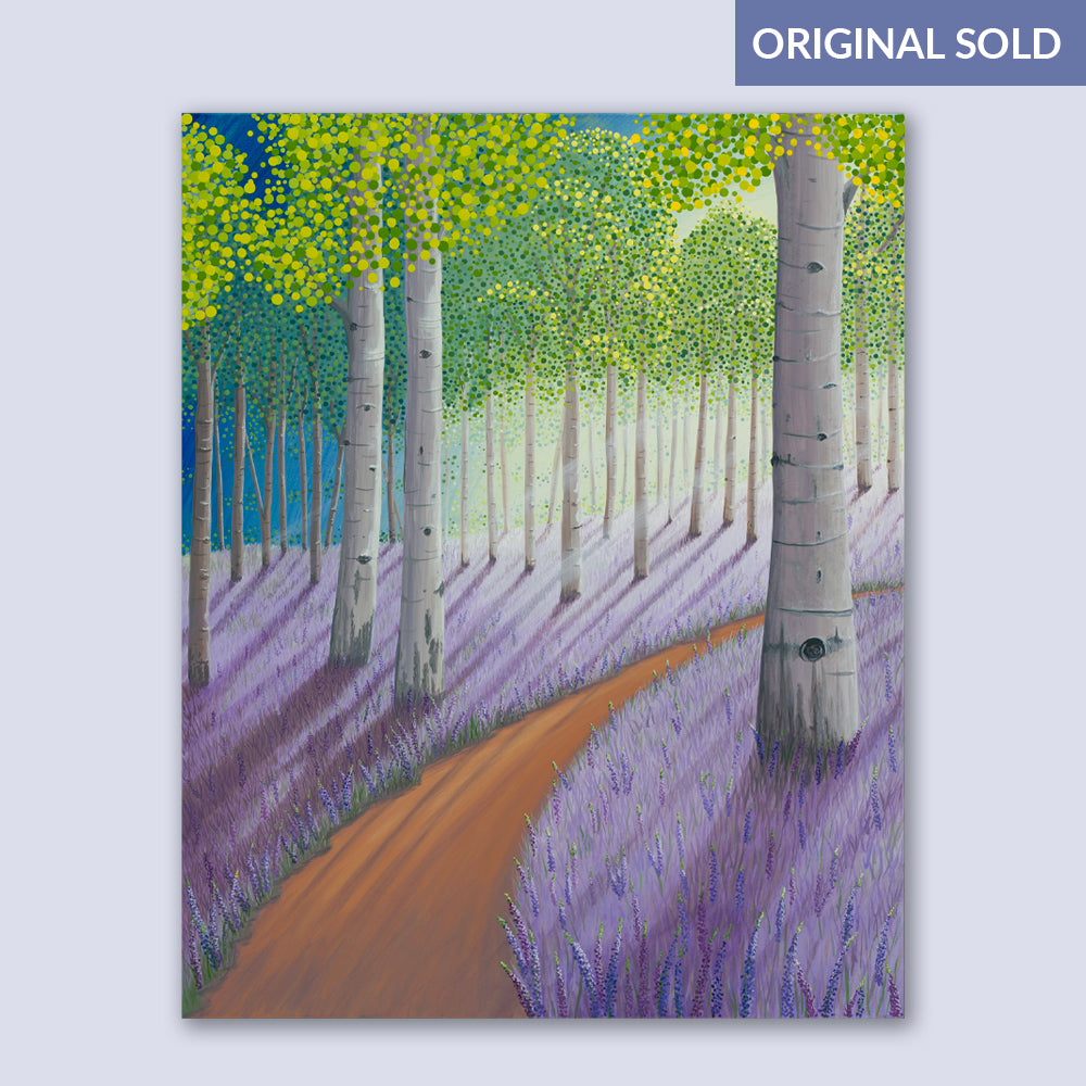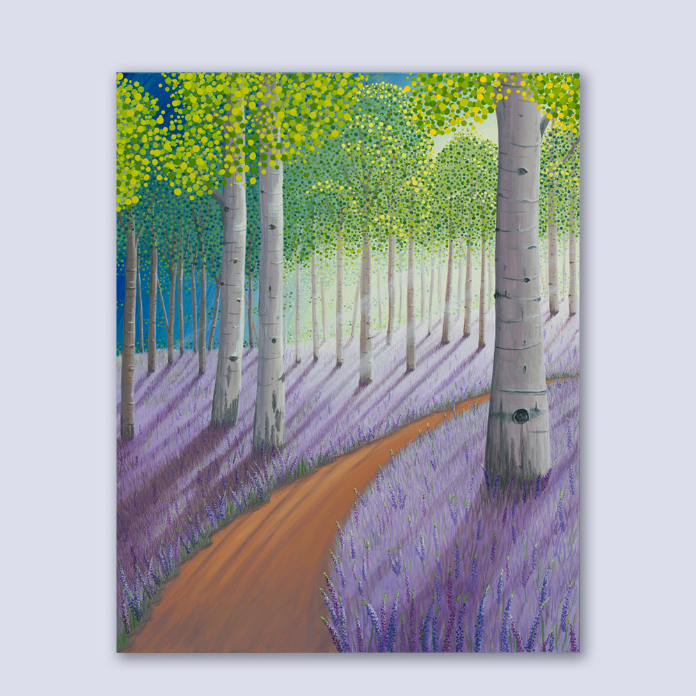 In this Colorado painting, bright and colorful lupine blanket a grove of aspens on a misty day.