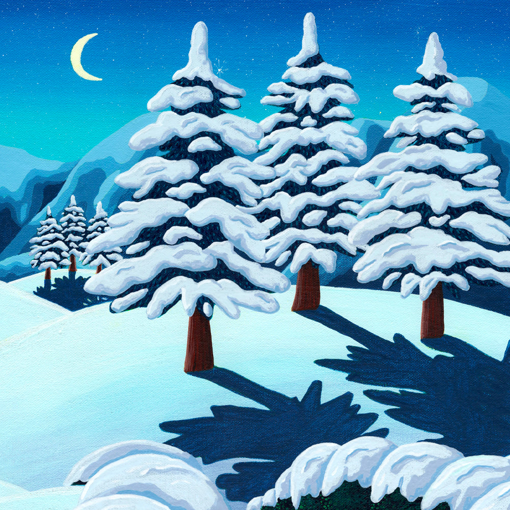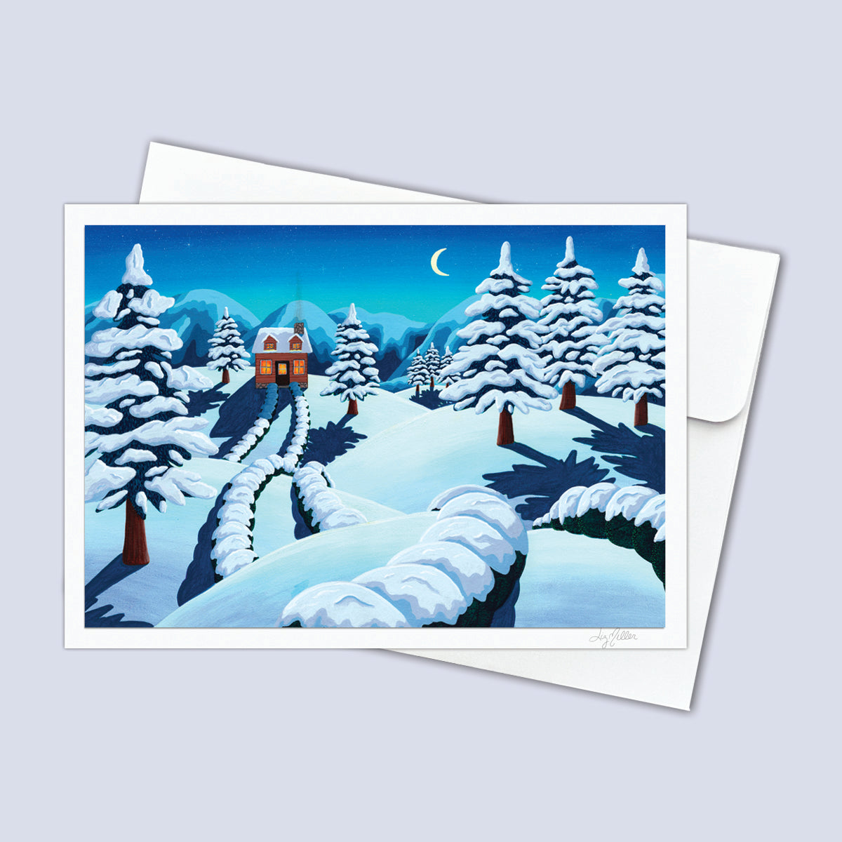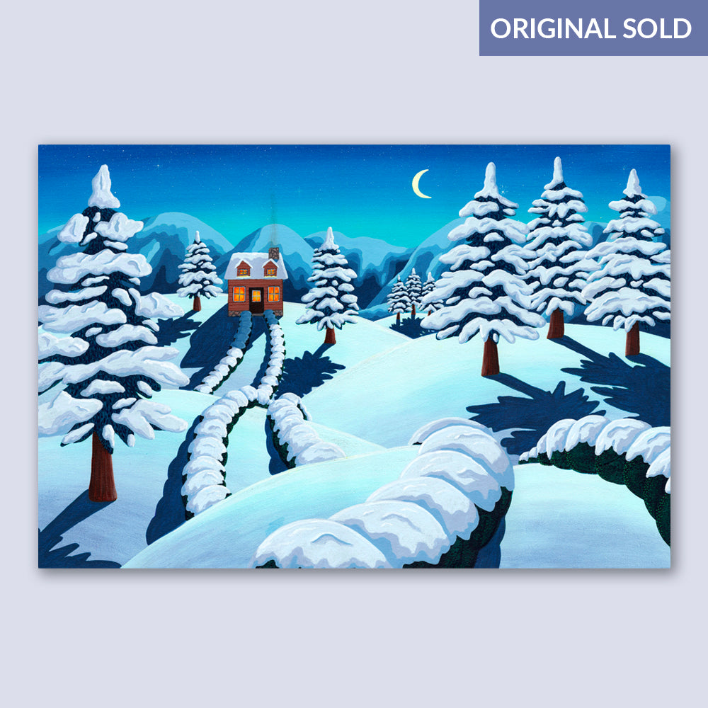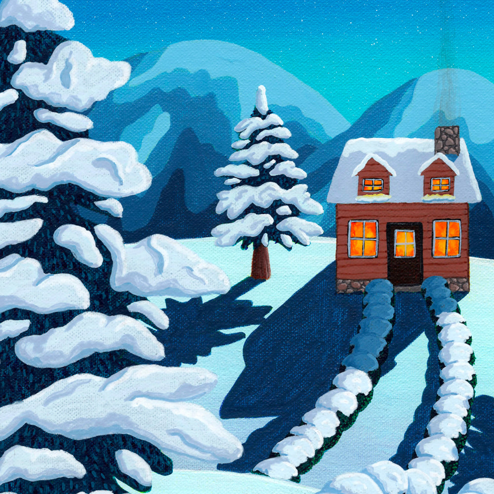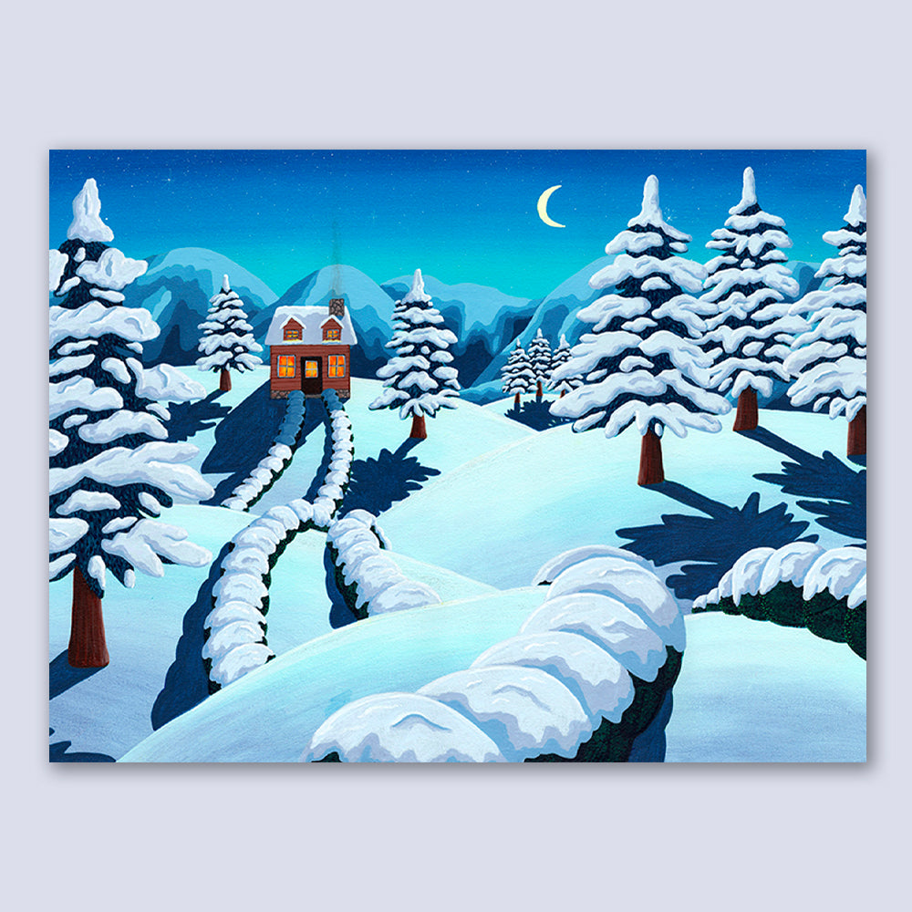 A peaceful winter scene with a quaint log cabin amongst snow covered hills and trees. Off in the distance, mountains are highlighted by the shining stars and moon above.