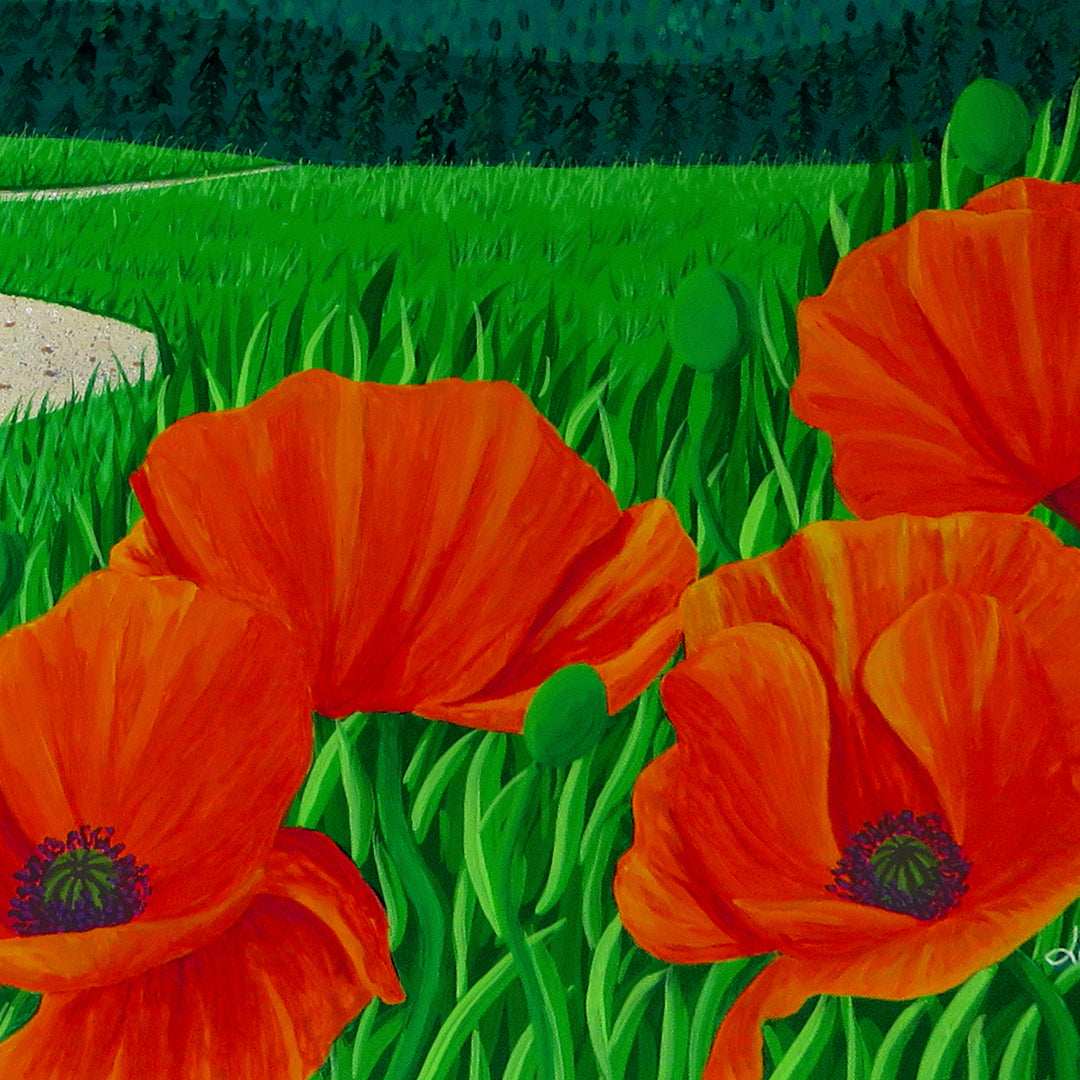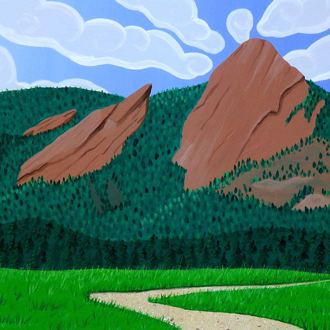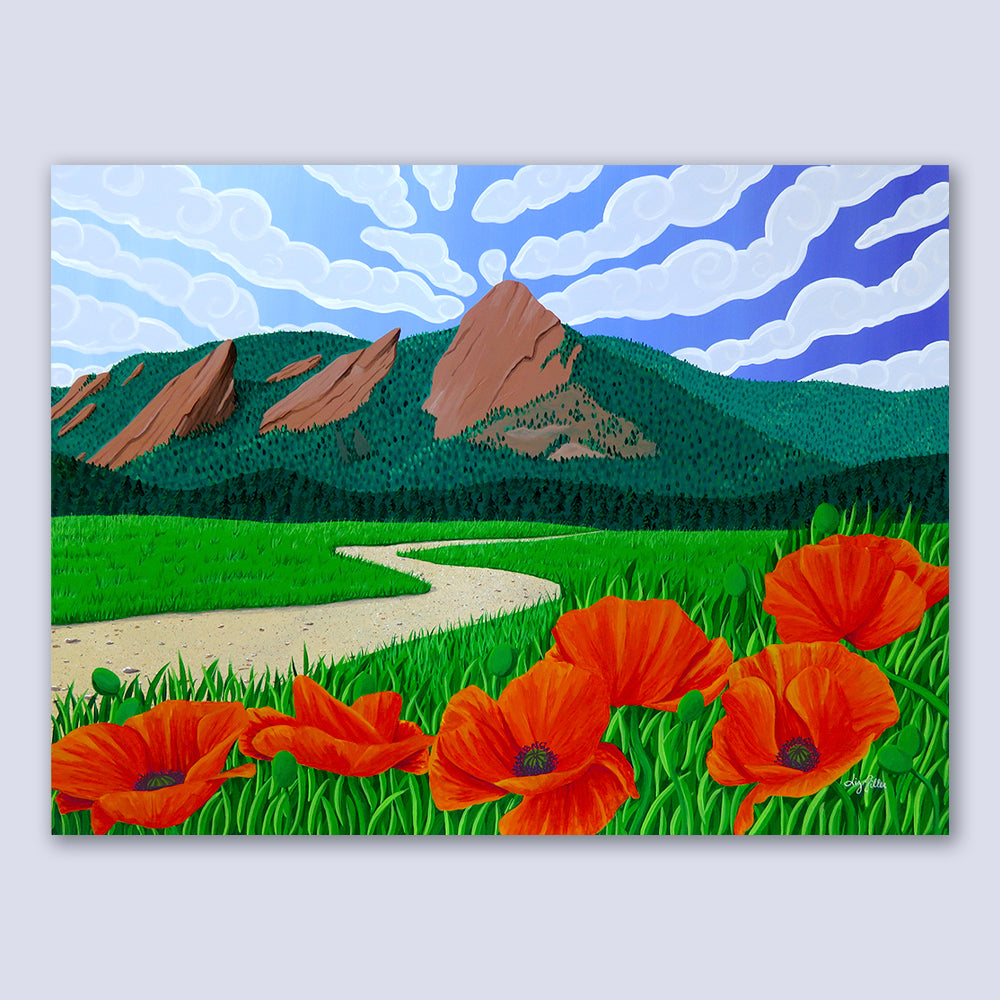 Bright and bold poppies create a dramatic foreground in this Boulder flatirons and Chautauqua painting.
