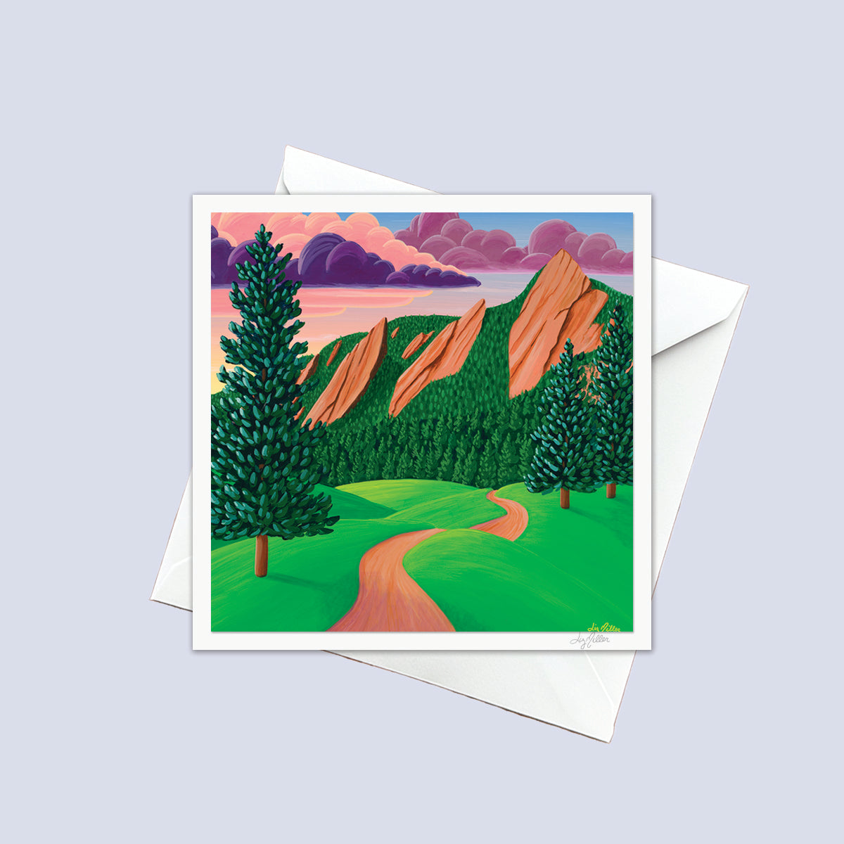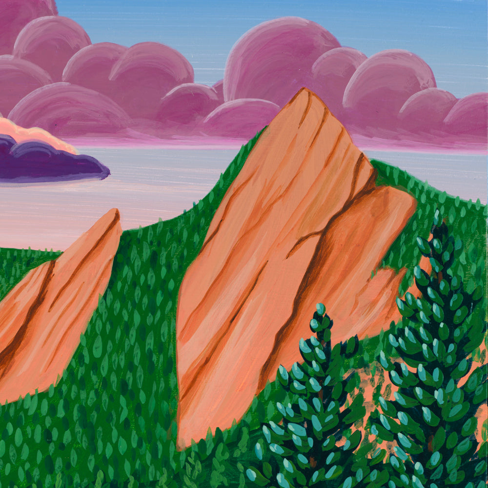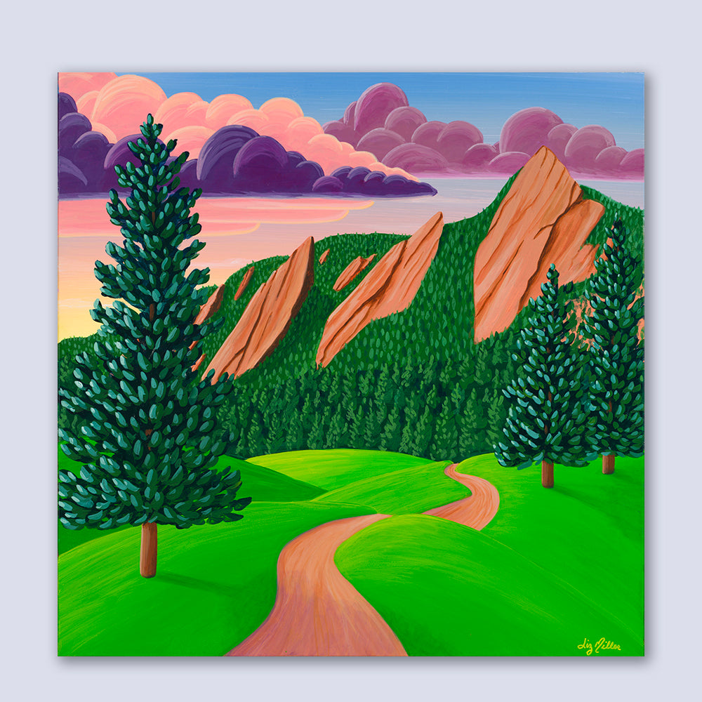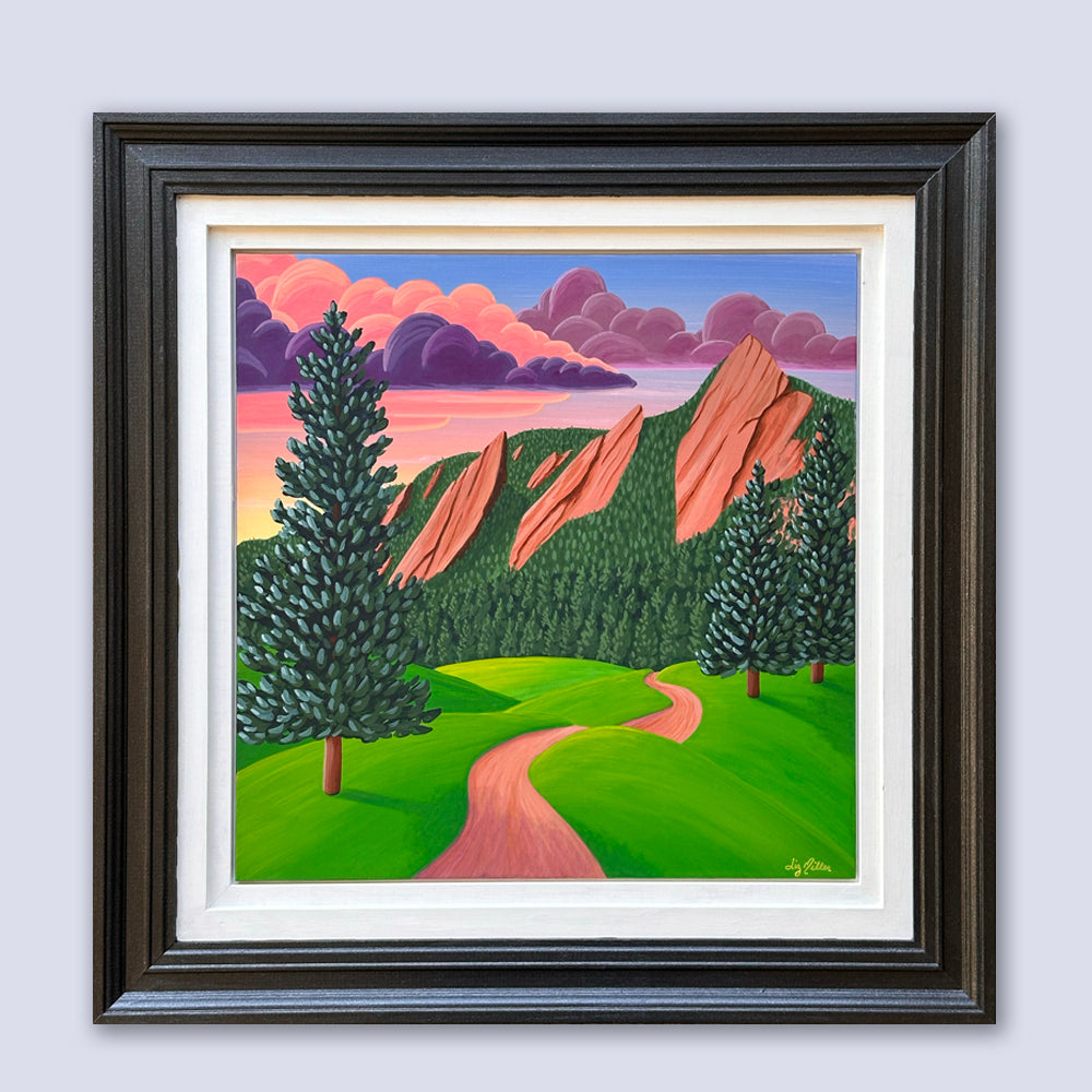 A bright and colorful sunset creates a dramatic background in this Boulder flatirons and Chautauqua painting.