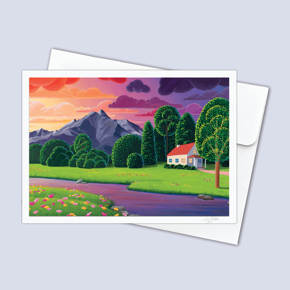 This glorious sunset sky over Longs Peak is highlighted by fields of poppies, a meandering stream, and a quaint house in the foreground.