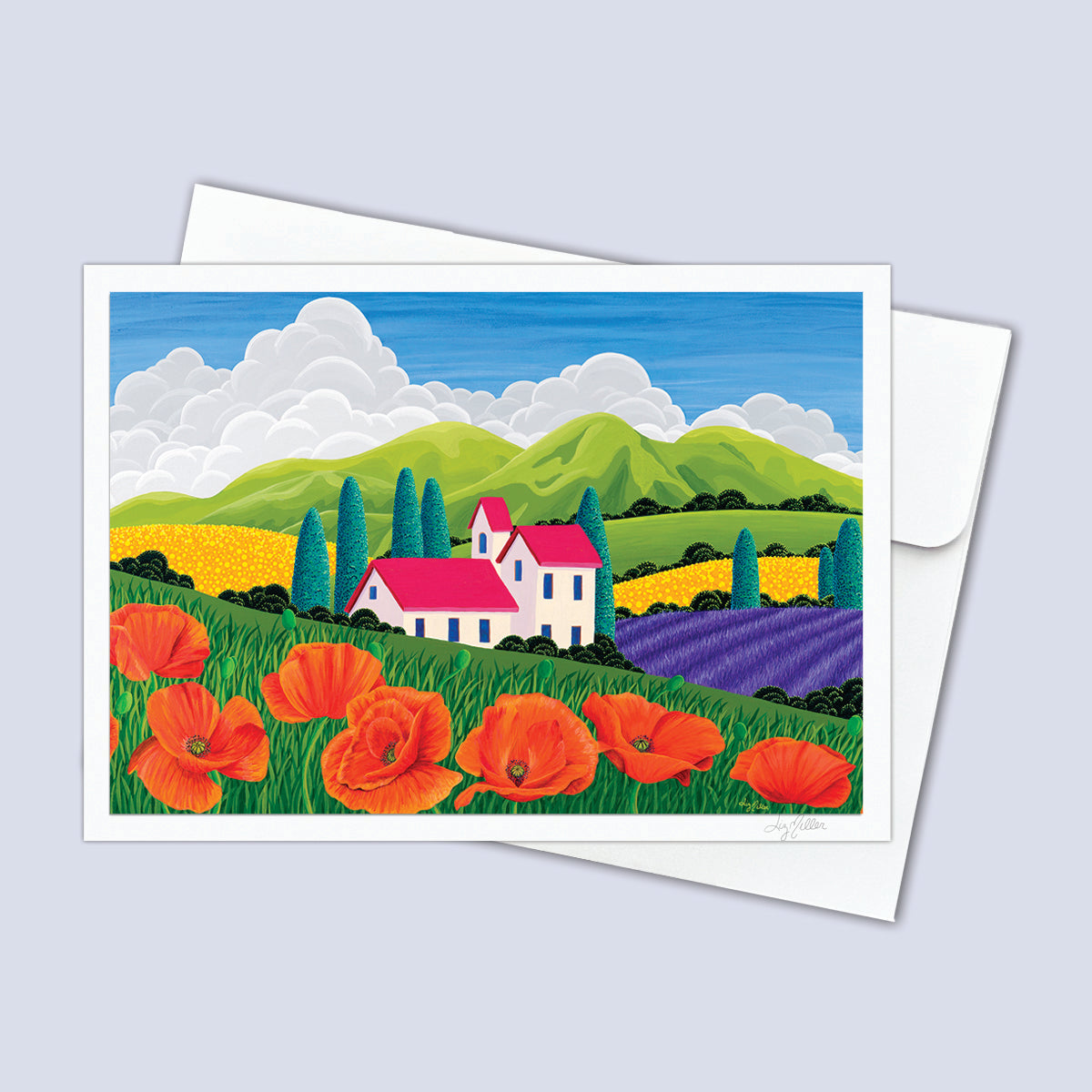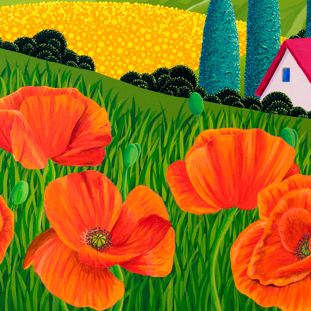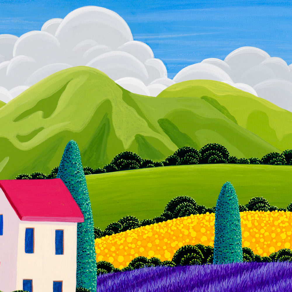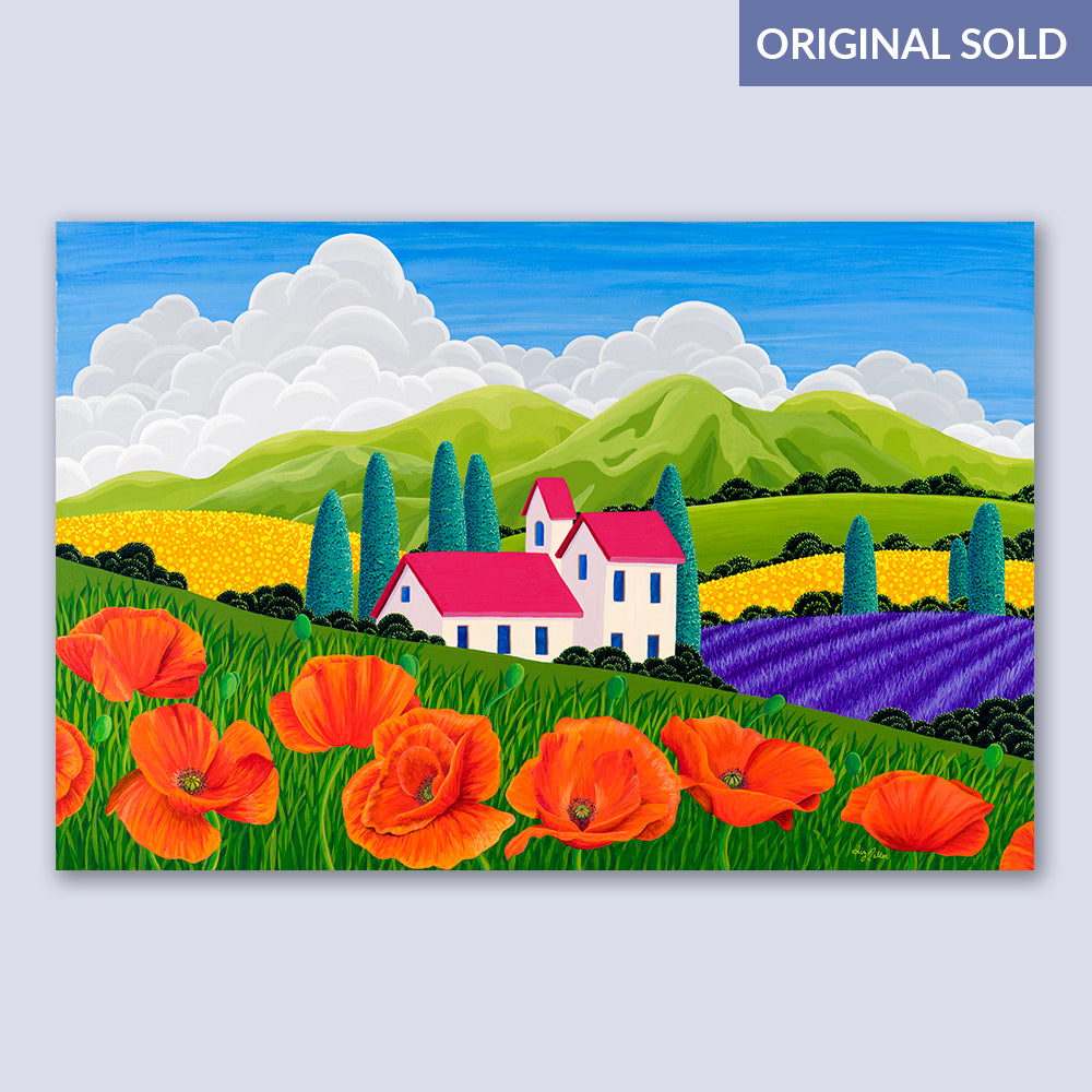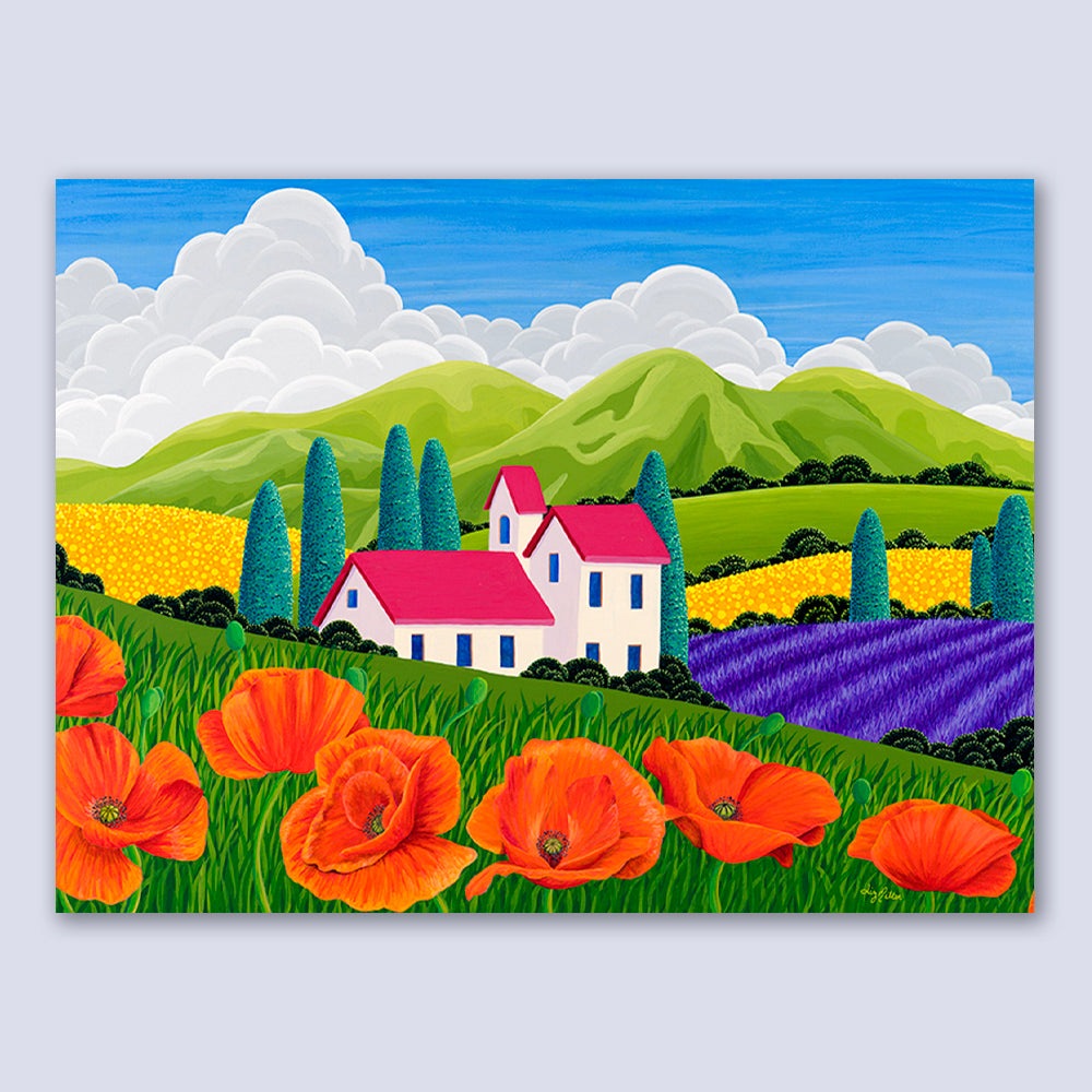 Rolling hills of yellow sunflowers, purple lavender, and bright orange poppies all go in to creating this dramatic painting.