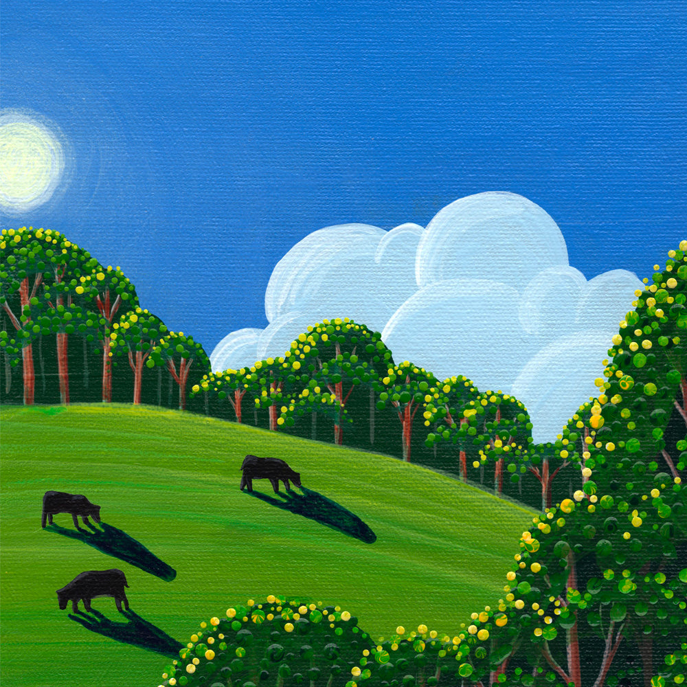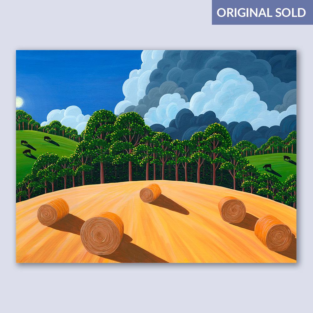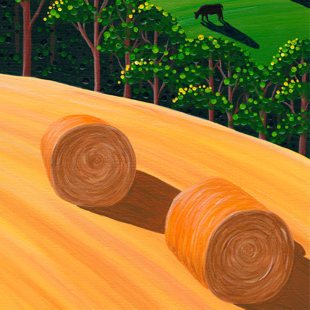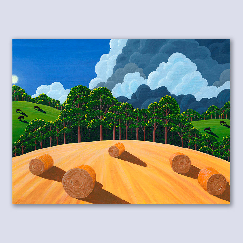 Bright rolling hills with sunlit hay bales and grazing cows. A passing storm off in the distance.